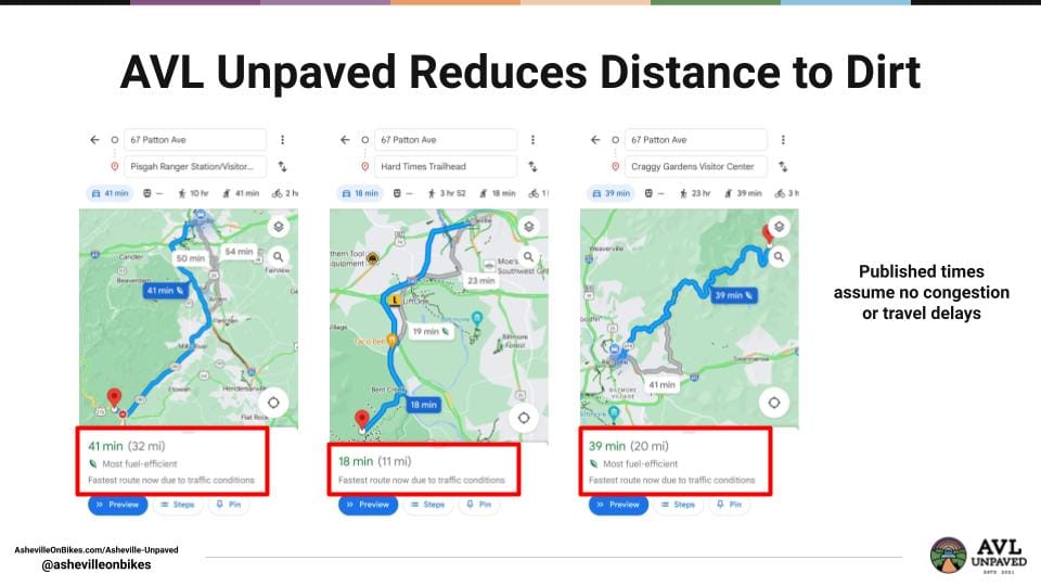 Asheville Unpaved is needed now because we should not keep building infrastructure that causes people to rely primarily on a car, that reserves our best outdoor experiences for our most privileged residents, and that makes it difficult to live a long life at full health within our City.
