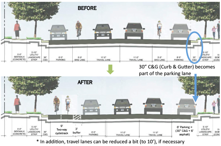 On July, 28th City Council meeting, city leaders approved funding changes to the street design of the River Arts District Transportation Improvement Plan (RAD TIP) to incorporate a separated, two-way cycletrack for portions of Riverside Drive and Lyman Street.